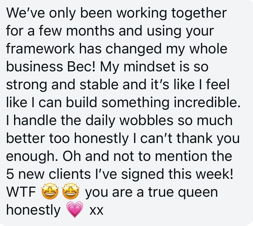 Stabilise your nervous system at a higher level.This is where most women fall short.Because success doesn’t come from pushing harder, it comes from being able to hold more without tipping into stress.We train your system to feel safe with:• more money